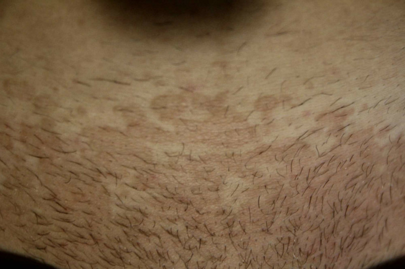 Темные участки кожи формируются в тех местах, которые не затронуты заболеванием, в то время как пораженные области выглядят значительно светлее.