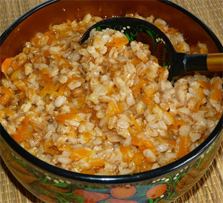 | Каша из пшеницы с морковью | 1. В 3 чашках воды довести до кипения 300 г пшеницы. 2. За это время нарезать 2 моркови и 2 луковицы. 3. Обжарить овощи на небольшом количестве сливочного масла до полуготовности. 4. Добавить обжаренные овощи в кашу и поместить в духовку на 30 минут. | |