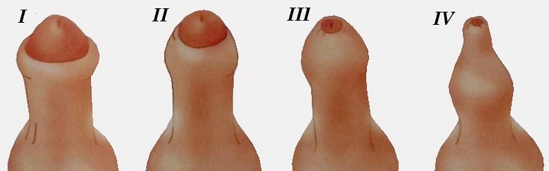 Существует несколько стадий фимоза, при которых открытие головки полового члена затруднено: