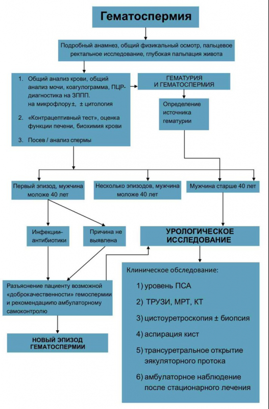 На представленном ниже рисунке можно увидеть алгоритм обследования пациента и подходы к лечению в зависимости от причин, вызывающих появление крови в сперме у мужчин. В схеме аббревиатура ЗППП обозначает инфекции, передающиеся половым путем.