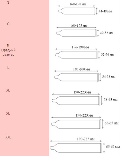 На рынке представлены пять категорий размеров презервативов, которые можно увидеть в таблице ниже: