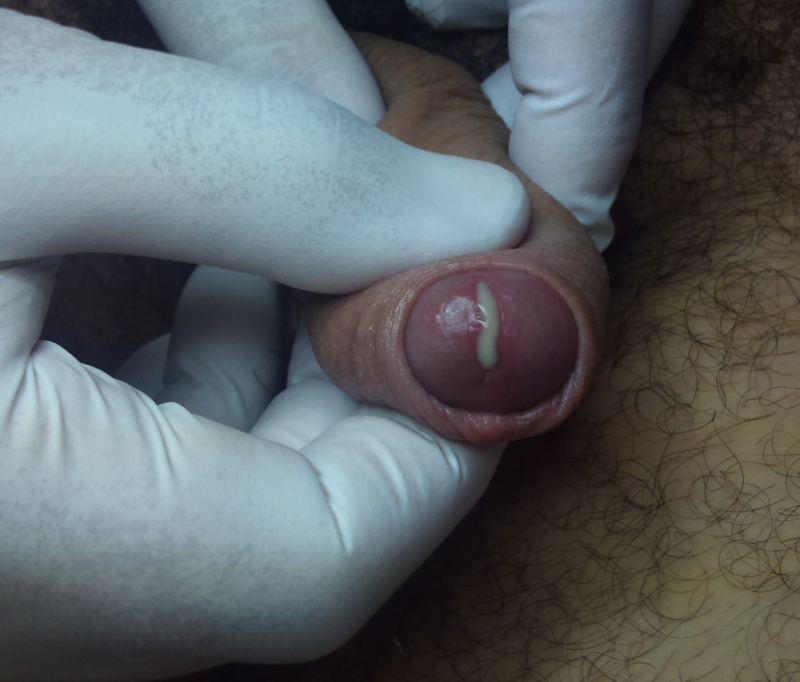 Объективные признаки можно заметить при наружном осмотре. Область наружного отверстия уретры выглядит гиперемированной (губки полового члена краснеют и отекают). При нажатии на орган врач может наблюдать выделения желто-зеленого цвета.