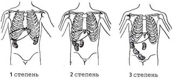 - На третьей стадии орган опускается на 3 позвонка и может частично входить в таз. Боли становятся сильными и частыми, нередко развиваются инфекционные заболевания, наблюдаются общее недомогание, слабость и головокружение. Патология легко прощупывается в любом положении тела.