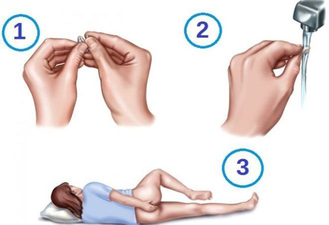 - Лежа на левом боку, подтянуть правую ногу к груди и аккуратно ввести суппозиторий в расслабленный анус.