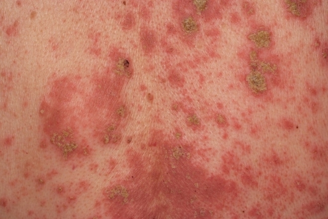 - Сгруппированный. Бугорки располагаются на небольшой ограниченной области кожи, близко друг к другу, разделенные узкими участками здоровой кожи, не сливаясь. Максимальное количество бугорков может достигать 40. В этой зоне можно наблюдать как новые бугорки, так и рубцы.