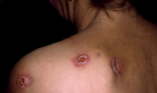 В таком состоянии они сохраняются примерно два месяца, после чего либо рассасываются, либо на их месте возникают язвы. При рассасывании наблюдается шелушение и уменьшение уплотнения (инфильтрата). После исчезновения бугорка образуется рубец, который со временем принимает обычный цвет кожи.