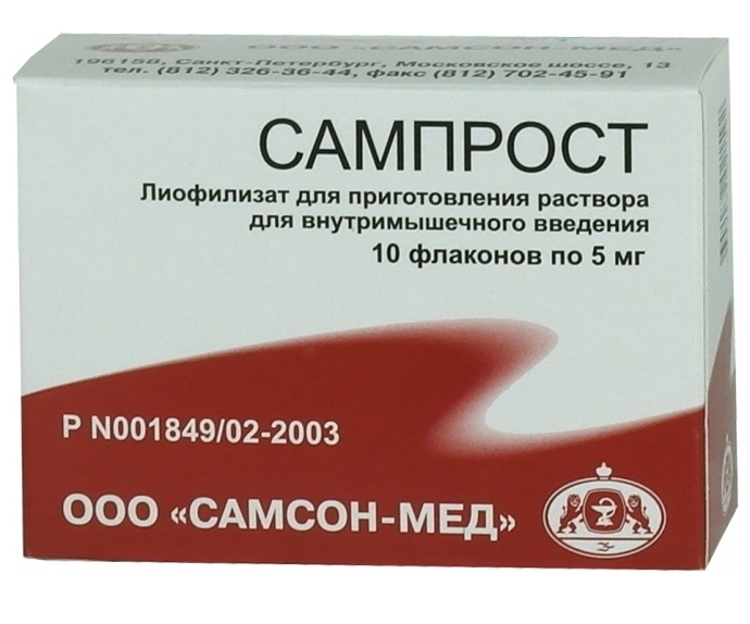 Сампрост является аналогом препарата Витапрост, но доступен исключительно в инъекционной форме (лиофилизат для приготовления раствора для внутримышечного введения) с содержанием 5 мг активного вещества и 10 мг глицина. Упаковка включает 10 флаконов, стоимость которых составляет около 300 рублей.