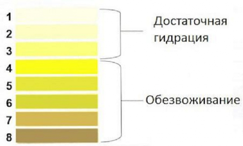 | Темно-желтый/Янтарный | Недостаточное потребление жидкости (обезвоживание), утренний концентрат мочи | Жажда, сухость во рту, снижение частоты мочеиспускания |